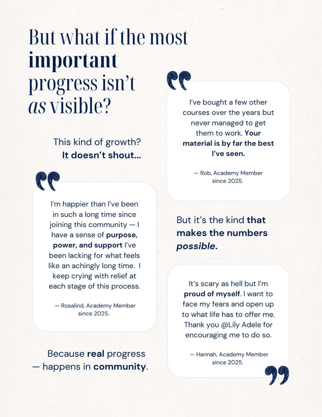 Inside, progress looks steady — not loud. You’re supported to notice the subtle shifts, do more of what works, and keep going; even when the results aren’t obvious yet.
